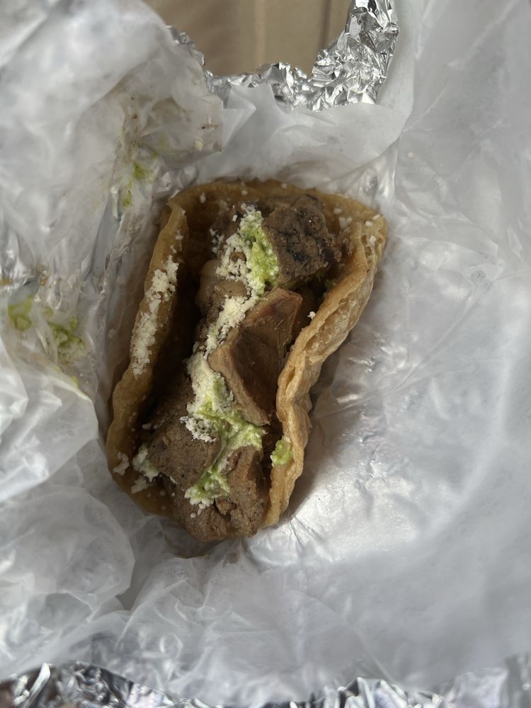 Skirt steak seasoned to perfection grilled to a medium well level garnished with avocado sauce and queso cotija